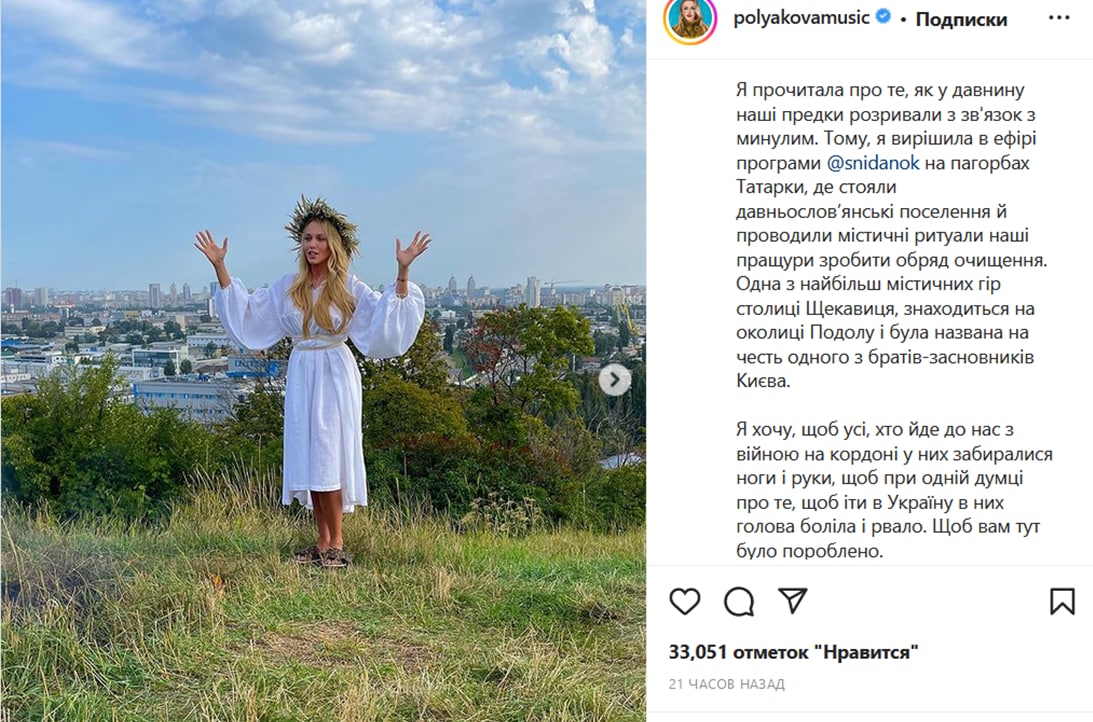 Известная украинская артистка Оля Полякова на глазах у зрителей программы "ТСН" в месте силы провела специальный очищающий и в то же время защитный ритуал, с помощью которого попыталась освободиться от своего прошлого, связанного с РФ, и привлечь счастливое будущее для всей Украины.