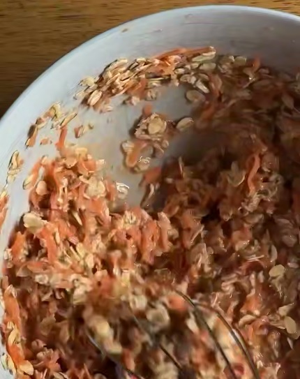 - смешайте в миске овсянку, тертую морковь, разрыхлитель, корицу, соль, сироп, яйцо и молоко. Можно использовать блендер или просто перемешать вручную;
