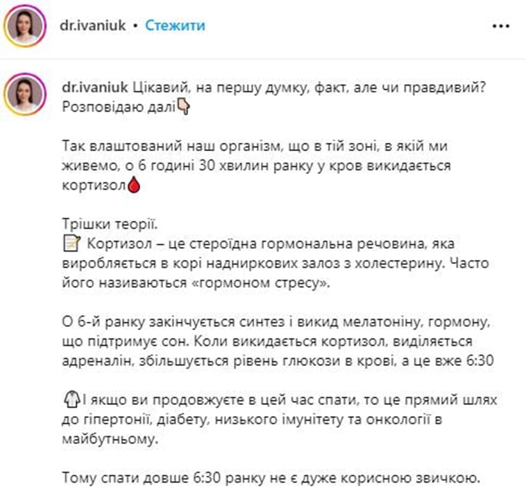 Кардіологиня Наталія Іванюк зазначає, що сон після 06:30 - шкідлива звичка. Чоловікові потрібно спати 7 годин на добу, а жінці 8, отже, щоб прокинутися о 06:30, чоловікові потрібно лягти о 23:30, а жінці о 22:30.