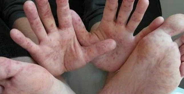 Але найбільш характерною ознакою вважаються дрібні водянисті пухирцеві висипання у роті, на долонях і ступнях.